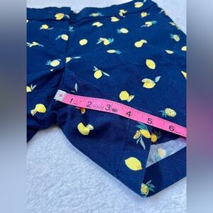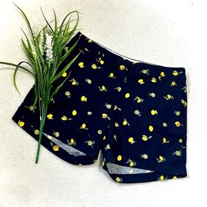J. Crew branded 5" Chino style shorts in a navy blue color with an all-over preppy lemon print, higher rise, lightweight 100% cotton fabrication, side slit front pockets with sewn back pockets, hook & eye + zipper closure.