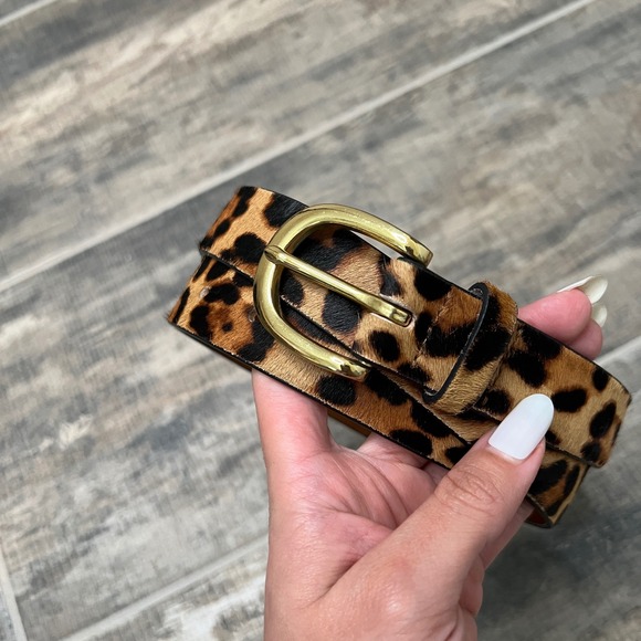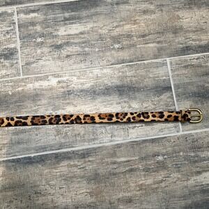 J Crew leopard print calf hair belt with a classic gold buckle. This stylish accessory adds a touch of wild sophistication to any outfit. Crafted from genuine leather on the underside, it offers both durability and a refined finish. Perfect for cinching dresses, adding flair to jeans, or completing a polished look.