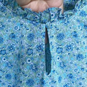 Details: Lightweight cotton, keyhole button front, feminine ruffle neckline & sleeve