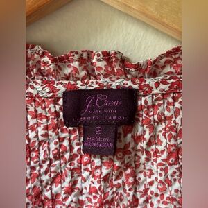 This elegant blouse from J. Crew x Liberty Fabrics features a charming puff sleeve design with a red floral perfect for adding a touch of sophistication to any outfit. The smocked detailing and ruffle mandarin collar enhance its stylish appeal, while the white and red hues create a vibrant and romantic look. Ideal for both casual and formal occasions, this top is a versatile addition to your wardrobe.