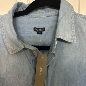 J. Crew chambray shirt in light blue. Features a classic collar and button-up front. NWT