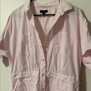 Chic light pink romper with button-up front. Features short sleeves and a relaxed fit.