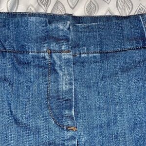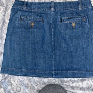 Structured thick denim skirt with slant front pockets then fasten with JCrew logo buttons. Back pockets Contrast stitching Zip hook closure size 4