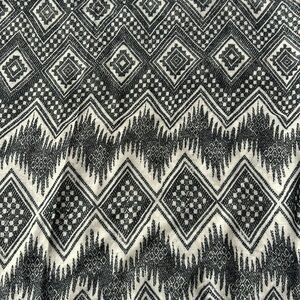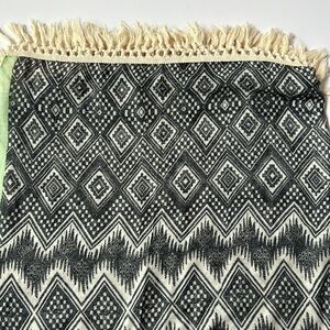 J Crew Lightweight Geometric Scarf. Dark gray/black & white geometric design with green edges. Natural color tassels along hems. Care tag missing(viscose/wool). Approx dimensions: 44(tassels add an extra 6” total) x 51”