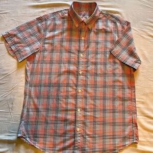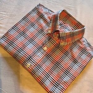 MINT! From the Lightweight collection, this one in a shocking plaid of neon orange, light blue, white, and navy! In a MEDIUM/SLIM. Traditional button-down collar and patch pocket at chest.