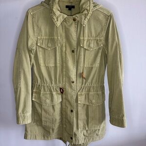 Classic J.Crew utility jacket with hood in a versatile olive green. Lightweight and easy to layer, multiple front flap pockets, and a hood for function and style. Perfect for spring, fall, or cool summer nights. Gently worn.