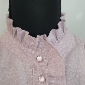 Chic sleeveless blouse in lilac with a tiny white flower print, with delicate ruffles. Perfect for any occasion.