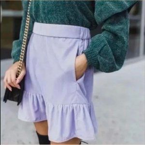 A beautiful velvet-feel skirt in light purple/lilac color that can be worn year round. Elastic waist with a flat front and a ruffle hem. Fully lined, on seam pockets. In excellent condition except for a black mark on the front, shown in photo.