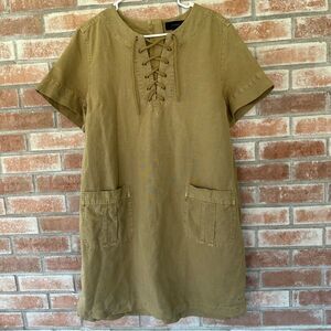 Women’s size 16 J. Crew shift dress. Soft canvas like material, linen and cotton blend material. Laces up in the v neckline, front pockets. Khaki tan color, excellent condition.