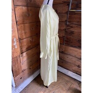 The first eight photos were taken in natural light, the rest were indoors. The lemon yellow of this dress is represented best in the final material tag photo, but please examine all photos for condition and measurements. This is a belted dress with side slits. The length is approximately 52