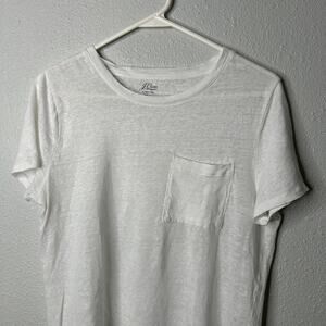 Classic J. Crew linen pocket tee in white. Lightweight and breathable with a crew neckline, short sleeves, and chest pocket for a casual yet polished look. Perfect staple piece for layering or wearing solo in warm weather.