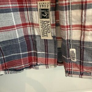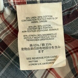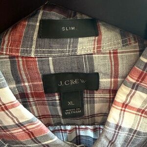 Classic linen plaid shirt with red and blue tones. Made by J. Crew.