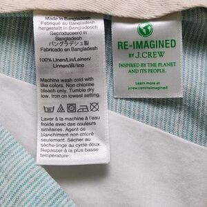 J.CREW linen shorts in a trendy green and white striped pattern. These shorts feature a flat front and a comfortable mid-rise waist with a zipper closure for easy wear. The slash pockets provide ample space for your essentials, making them perfect for travel or casual occasions. Crafted from lightweight linen fabric, these shorts are perfect for the warm seasons of spring and summer. They are easy to care for with machine washable instructions. These shorts are a great addition to any preppy wardrobe and are available in size 35 with a 9-inch inseam.