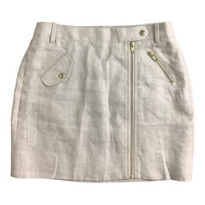 Motorcycle style meets linen. Exposed metal hardware, this airy mini looks as cool as it feels. Size 4. Falls above knee. Zip fly with snap closure. Zip pocket and welt pocket. Lined. Style 50962
