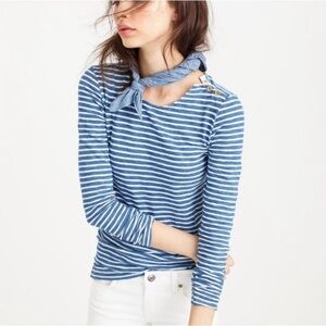 Blue and white stripes, long sleeve, fitted silhouette, round neck line, gold toned 3 button detail at shoulder, split hem.