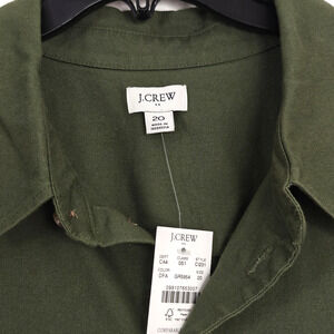 New with tag J Crew utility shirt dress in women's size 20. Olive green. Button closure. Long sleeves have button cuffs. Chest pockets. Hip pockets. Self tie belt. Elastic at the back waist.