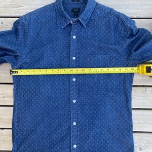 This J Crew Men's Slim Fit Mini Floral Lightweight Blue Denim Button Up Shirt is perfect for casual occasions and travel during the warmer seasons of summer, fall, and spring. Made from lightweight 100% Cotton denim fabric, this slim-fit shirt features a collared neckline, long sleeves, and a subtle yet stylish ditzy dot pattern that adds a touch of charm. With a button-up closure and a chest size of 41 inches, this shirt is easy to care for with machine washable instructions. Made by the well-known brand J.CREW, this shirt is a versatile and fashionable addition to any man's wardrobe.