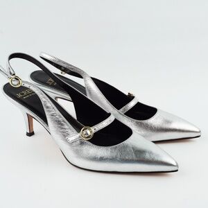 Elegant silver slingback heels. Pointed toe design. Adjustable strap with buckle. Reposhing these beauties since I never had an occasion to actually wear them! New without box. They were a store display model and have minor shelf wear. See all pics. Fit TTS.