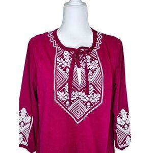 J. Crew Maroon Embroidered Tie Neck Tencel Cotton 3/4 Sleeve Boho Tunic Top. Sleeves have elastic cuffs. Super soft and luxurious feeling. Size Small. Measurements take flat: