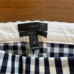 J. Crew Martie Gingham Ankle Pants in a size 4. Has a side concealed zipper and two faux front pockets. Two faux back pockets. Measures approximately 15" flat lay waist, 10" rise, and 25 1/2" inseam. 96% cotton, 4% elastane. In great condition.