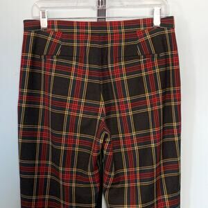 These pants feature a rich tartan plaid in charcoal, red, green, yellow and white in a bi-stretch wool. Perfect for winter and the holidays! Mid rise with a crop-length cut. Front slant pockets, back welt pockets. Fully lined. In excellent condition.