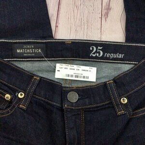 J. Crew women’s Matchstick skinny straight fit jeans with a hint of stretch. Sits lower on the hips. Slim through hip and thigh. Slim straight leg. Traditional five pocket style. Button and zip closure. Size 25 regular. Made of a cotton/polyester/spandex blend. Machine washable. New with tags. Smoke free home.