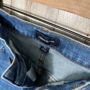 - great preowned condition. button fly. womens size 30. cotton/polyester/elastane blend. raw hem.