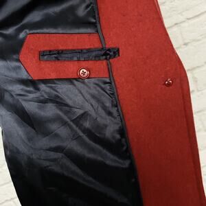 We created this jacket just for you so you can finally stop stealing his. Menswear style and totally classic A cozy silhouette in tight knit Melton cloth wool made in a marked red color. Clean lines and a navy trim collar gives the coat a versatile feel.