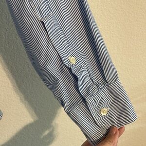 Stylish light blue pinstripe shirt. Features button-down design. Perfect for casual wear.
