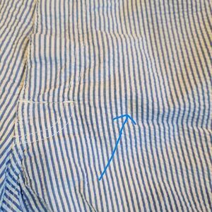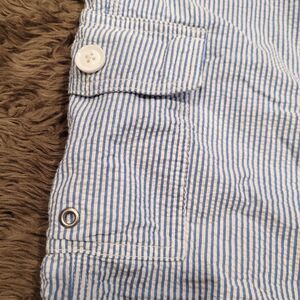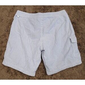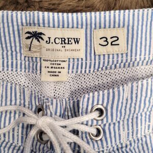J. Crew Men's 32 Seersucker Board Shorts Swim Trunks Blue White Stripe Beach. One small stain on the front of the shorts. Please see photo. It's honestly hard to see.