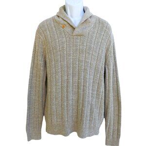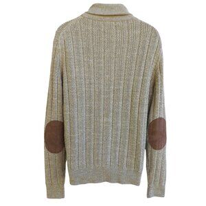 J Crew Mens Ecru Cable Knit Cotton Sweater Leather Elbow Patches Shawl Collar L