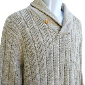 J Crew Mens Ecru Beige Cable Knit Cotton Pullover Sweater. Contrasting Brown Leather Suede Elbow Patches. Shawl Button Collar. Hand Wash 100% Cotton. Tagged Size L Large.