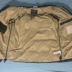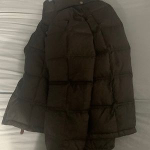 Black J. Crew Expedition Down jacket, size small, gently worn. All zippers and buttons are in tact and work perfectly. No marks on exterior or interior of garment. One large internal pocket, one small internal pocket, one exterior chest pocket, and two exterior standard pockets. All exterior pockets have button closures. The hood can be rolled down into the collar when not in use.