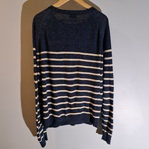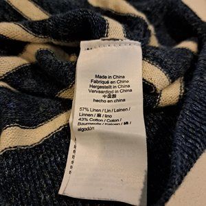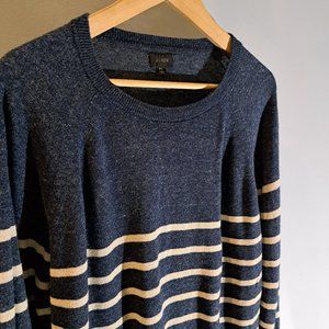 J. Crew Men's Extra Large Linen-Cotten Lightweight Crewneck Sweater. 57% linen 43% cotton. Ribbed neck, cuffs and hem. Dark Navy with white stripes and white specks throughout. Sweater is in excellent used condition. Please see photos for measurements and details.