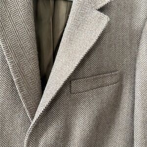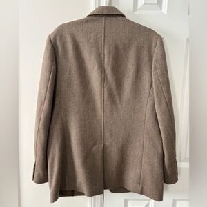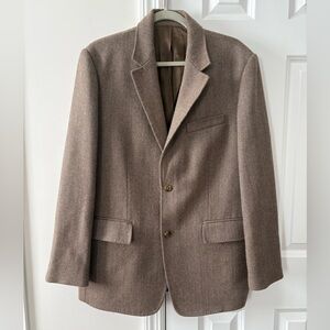 J. Crew Men’s Herringbone Blazer. Brown and tan colors. Material and size tag missing please see measurements. Seems to fit like a large. Very good condition, there is a small hole at lower back, see pic.
