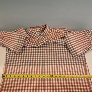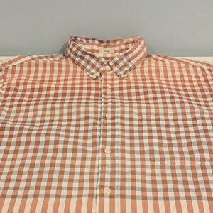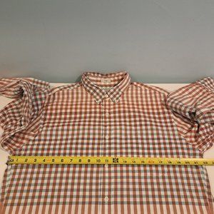 J. Crew Men's Large Slim Fit Stretch 98% Organic Cotton Shirt Style AI902. 98% organic cotton, 2% elastane. Single chest pocket. Button down collar. Blue, white, orange and red plaid. Shirt is in excellent used condition. Please see photos for details and measurements. This is a slim fit shirt.