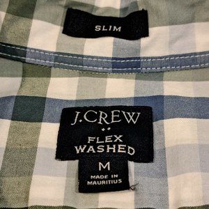 J. Crew Men's Medium Slim Flex Washed Long Sleeve Button Down Shirt Style #AL090. 98% cotton,2% elastane. Button down collar. Single chest pocket. White, blue, green and gray plaid. Shirt is in excellent used condition. Please see photos for details and measurements. This is a slim fit shirt.