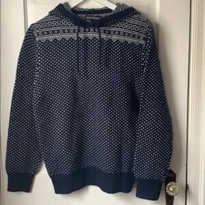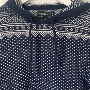 NEW! J Crew Mercantile Navy Men’s Pullover Hoodie Sweater is a blend of 70% Nylon and 30% Lamb’s Wool. A quality medium-weight sweater for cold days! Brand new!