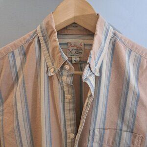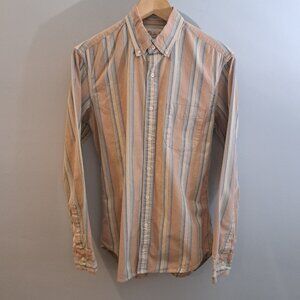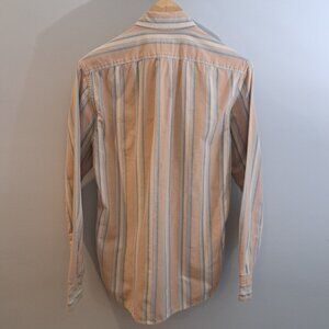 J. Crew Men's S Slim Fit Broken-In Oxford Long Sleeve Button Down Style #AU765. 100% cotton. Button down collar. Single chest pocket. Salmon, blue, light purple and white vertical stripes with white buttons. Shirt is in excellent used condition. Please see photos for details and measurements. This is a slim fit shirt.