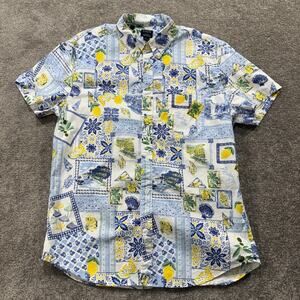 J Crew Mens SZ M Blue Yellow Patchwork Lemons Flex Washed Short Sleeve
