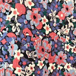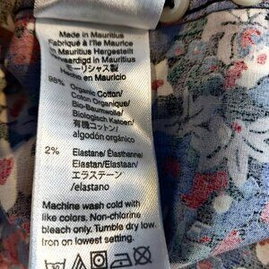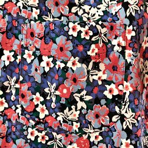 Good condition, minor signs of wear, no rips, holes or tears, nice purple/red spring floral print, slim fit, button front, short sleeve, single pocket, organic cotton/elastane blend