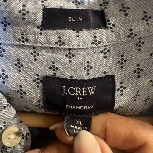 This is a J.Crew men's slim chambray button-down shirt in size XL with a dotted print. It has long sleeves, a collared neckline, and a button closure. Made of cotton, it is machine washable and features a slim fit with a preppy style. Suitable for travel, casual wear, and work attire, this shirt is designed for winter, summer, fall, and spring seasons