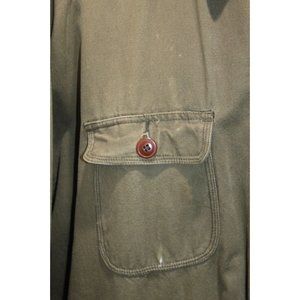 Vintage J Crew Oarsman Flannel Lined Barn Coat Leather Collar Chore Brown Field Jacket Vtg Mens Size XL. No holes, rips or tears. Perfect for outdoors, barn, chore, hunting khaki, preppy, some paint on right arm and pocket as shown. Overall all nice 1980s 90s Y2K condition. Rare Oarsman Label. Measures 29" chest, 25.5" shoulders, 25" sleeve and 33" length. back