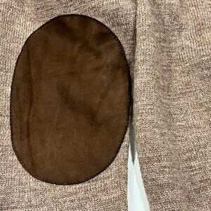 This 100% merino wool sweater features a high neck, 1/4 zip with leather pull, and suede leather elbow patches. Excellent condition, washable, camel tan and brown, size XL