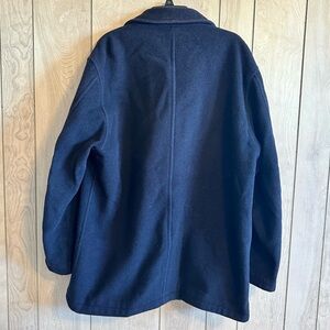 Double breasted Open side pockets Collared Navy blue 80% wool 20% nylon Good preowned condition!