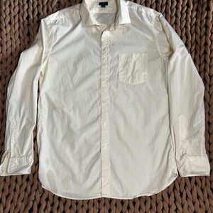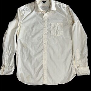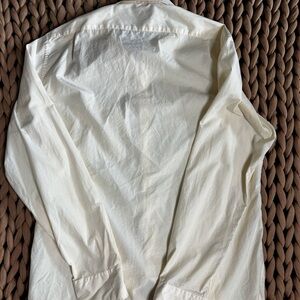 Stylish off-white dress shirt. Ideal for formal events. Classic collar and button-up design.