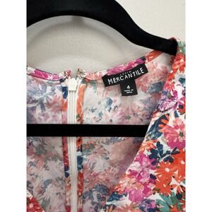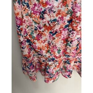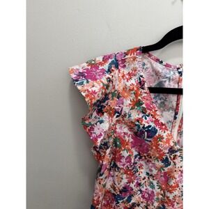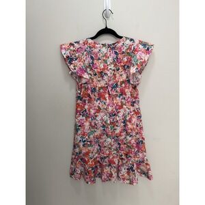 Bright and cheerful, this J.Crew Mercantile dress features a colorful floral print in vibrant shades of pink, orange, purple, and green. Designed with flutter sleeves, a flattering V-neckline, and a ruffle hem, it's the perfect summer dress for casual outings or special occasions. The back zipper adds a sleek finish while ensuring a secure fit.