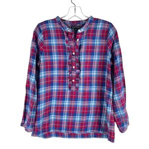 J. Crew Mercantile Flannel Plaid Popover Shirt Top Ruffle Blue Red