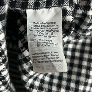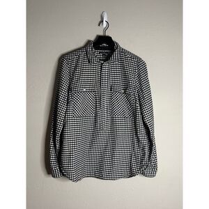 Black and white gingham shirt jacket from J. Crew Mercantile. Cotton flannel. Long sleeves with button cuffs. Popover style with zip closure. Patch pockets with button closure. Size S. See photos for measurements. Good preowned condition with no tears, picks, or stains.