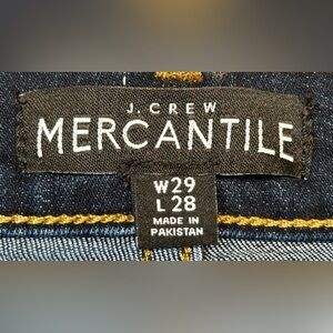J. Crew Mercantile Midrise Soft & Sexy Skinny Jean in Signature Stretch, 5-Pocket Styling, Belt Loops, and Zip Fly, Dark Blue, Size W29 L28. Sits just above hip. Fitted through hip and thigh, with a skinny, straight leg.